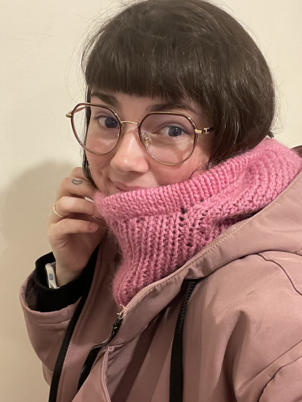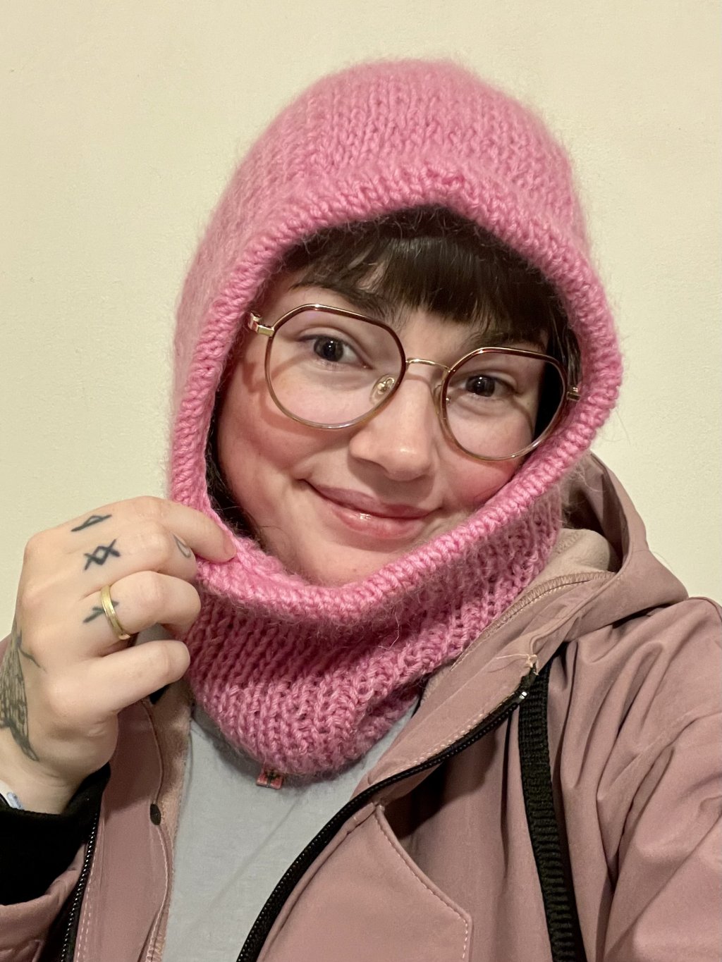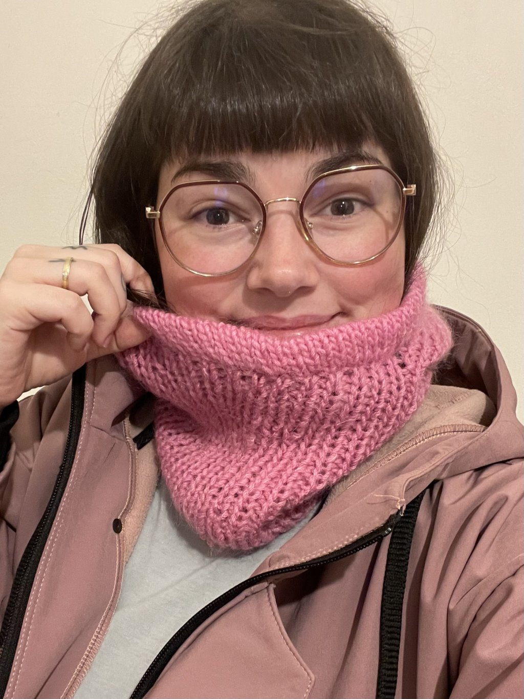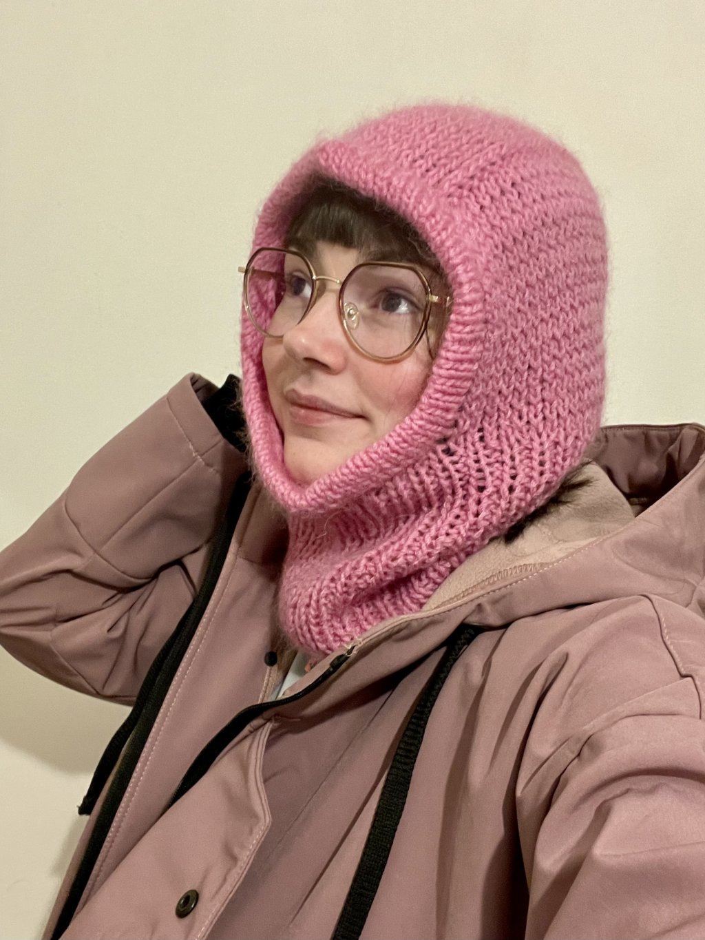 Ručně upletená kukla ze 100%merina a Mohéru s příměsí 28% hedvábí a 15% vlna.