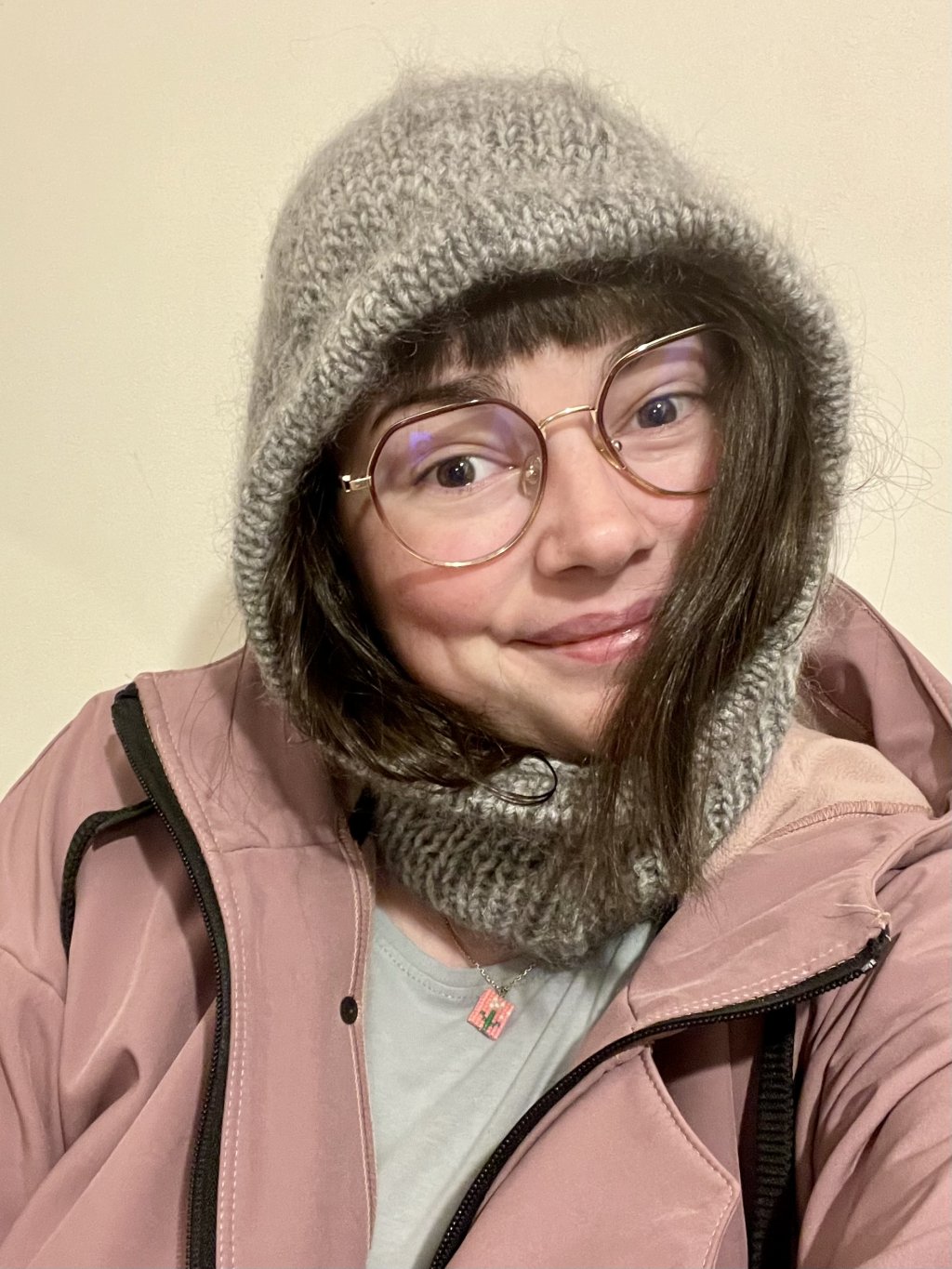 Ručně upletená kukla ze 100%merina a Mohéru s příměsí 28% hedvábí a 15% vlna.