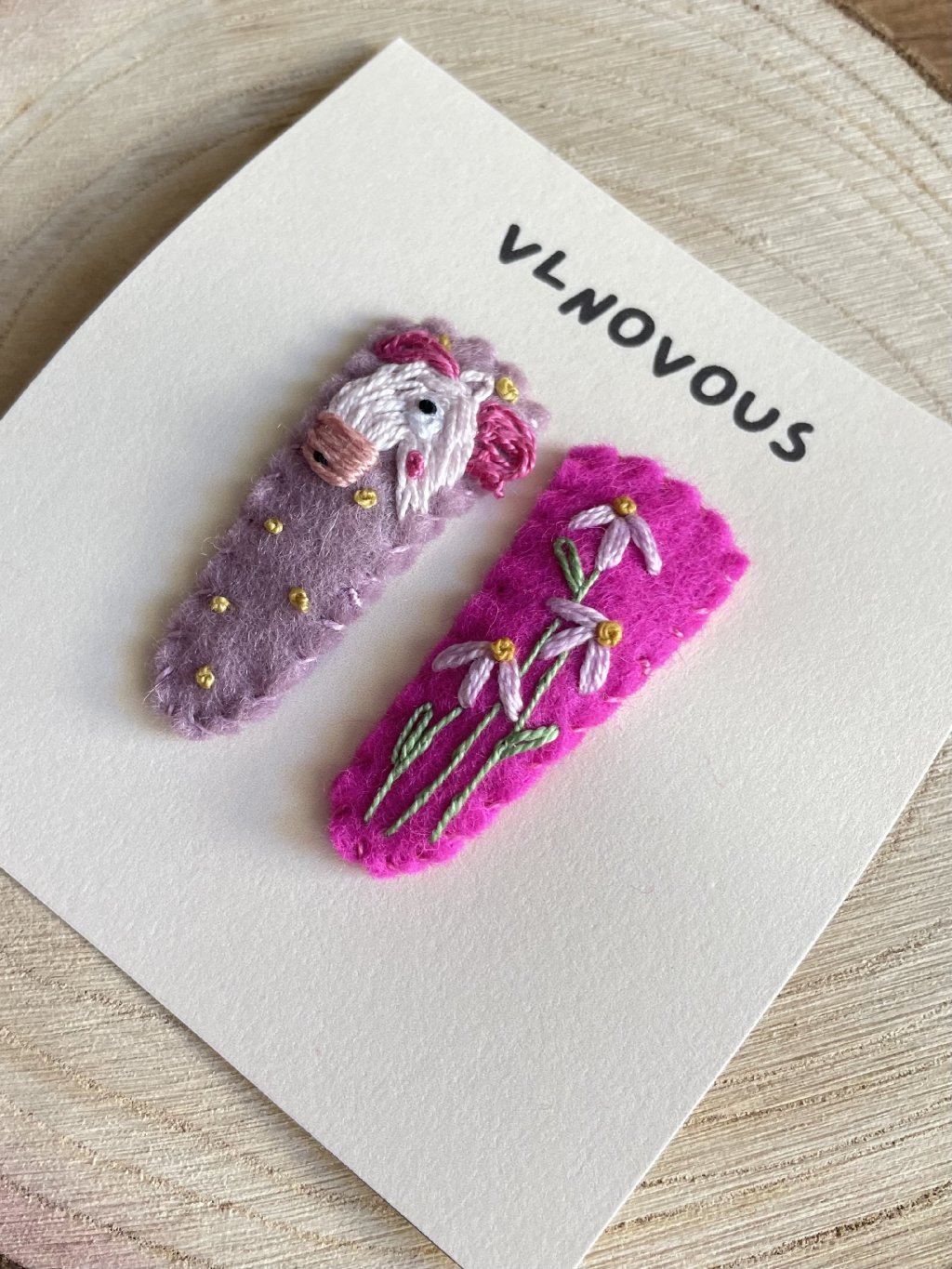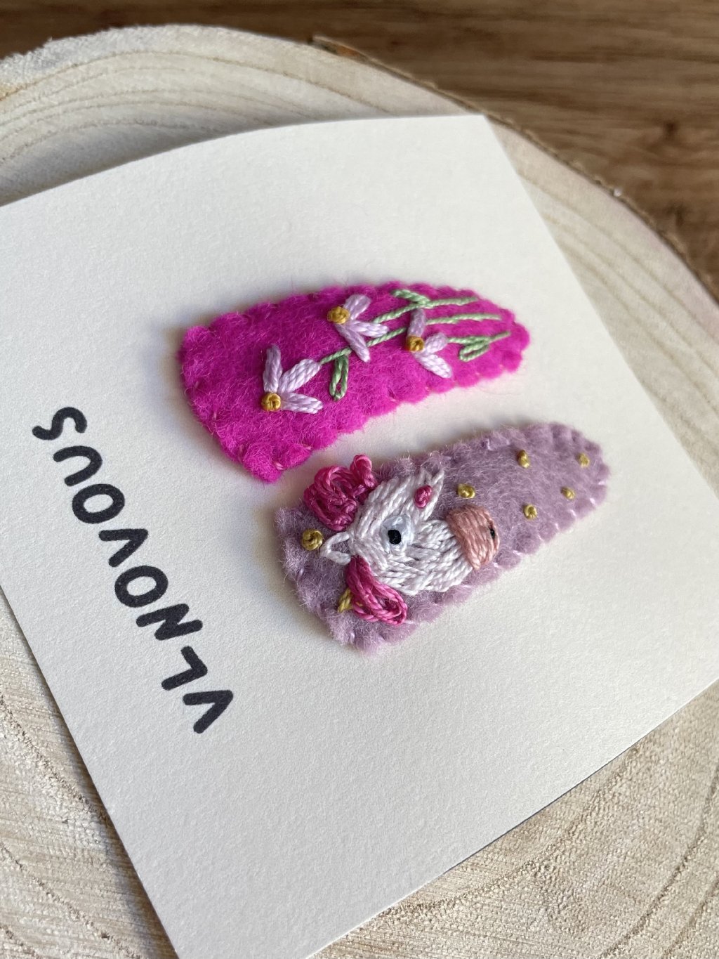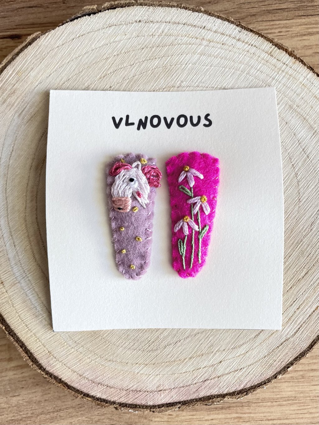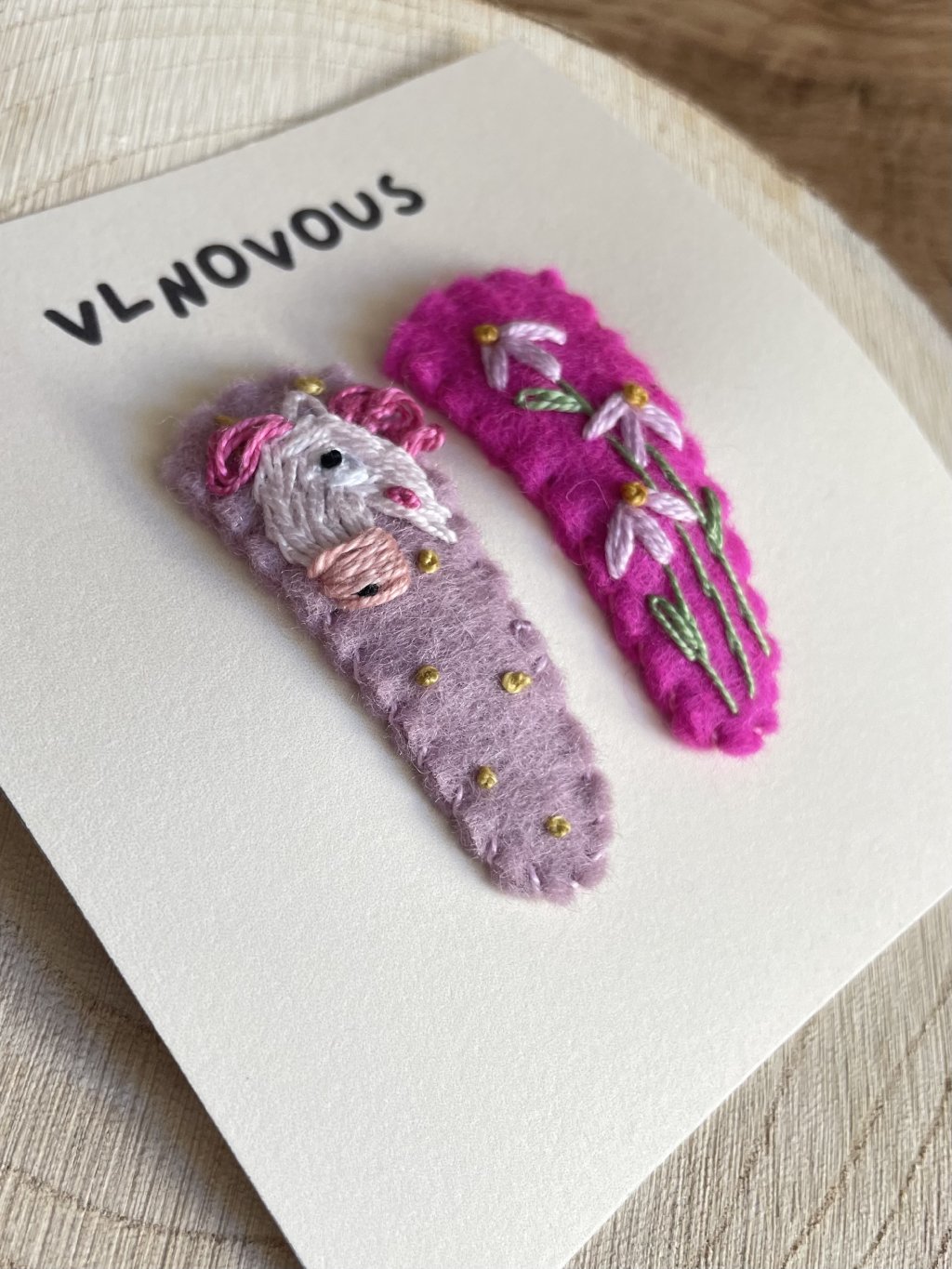Ručně vyrobené sponky z plsti s autorským motivem.