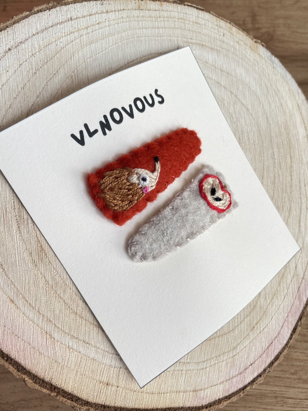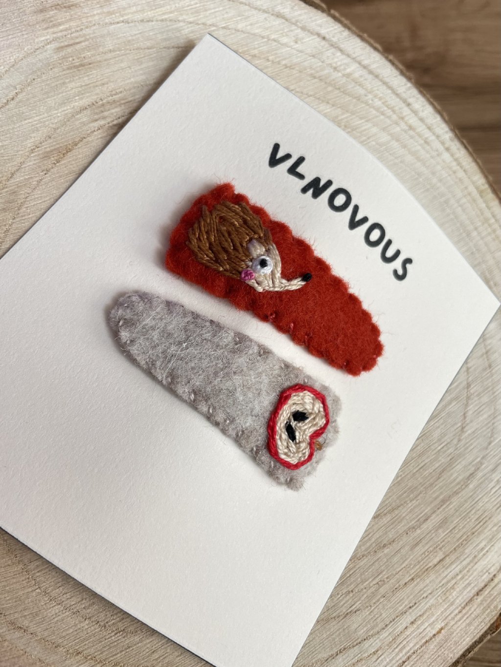 Ručně vyrobené sponky z plsti s autorským motivem.