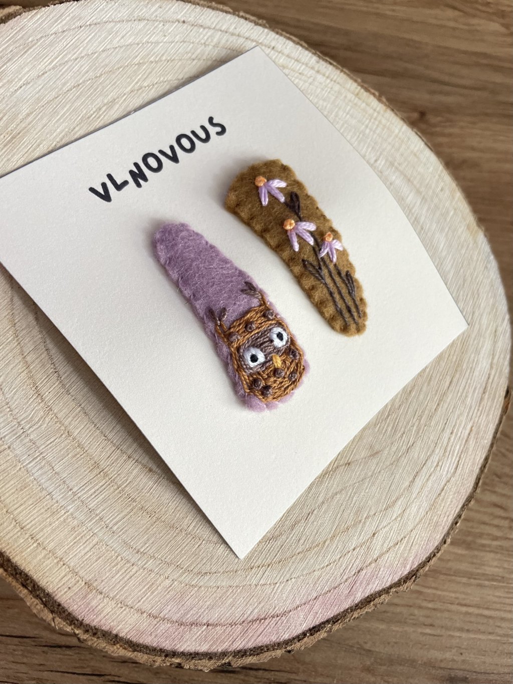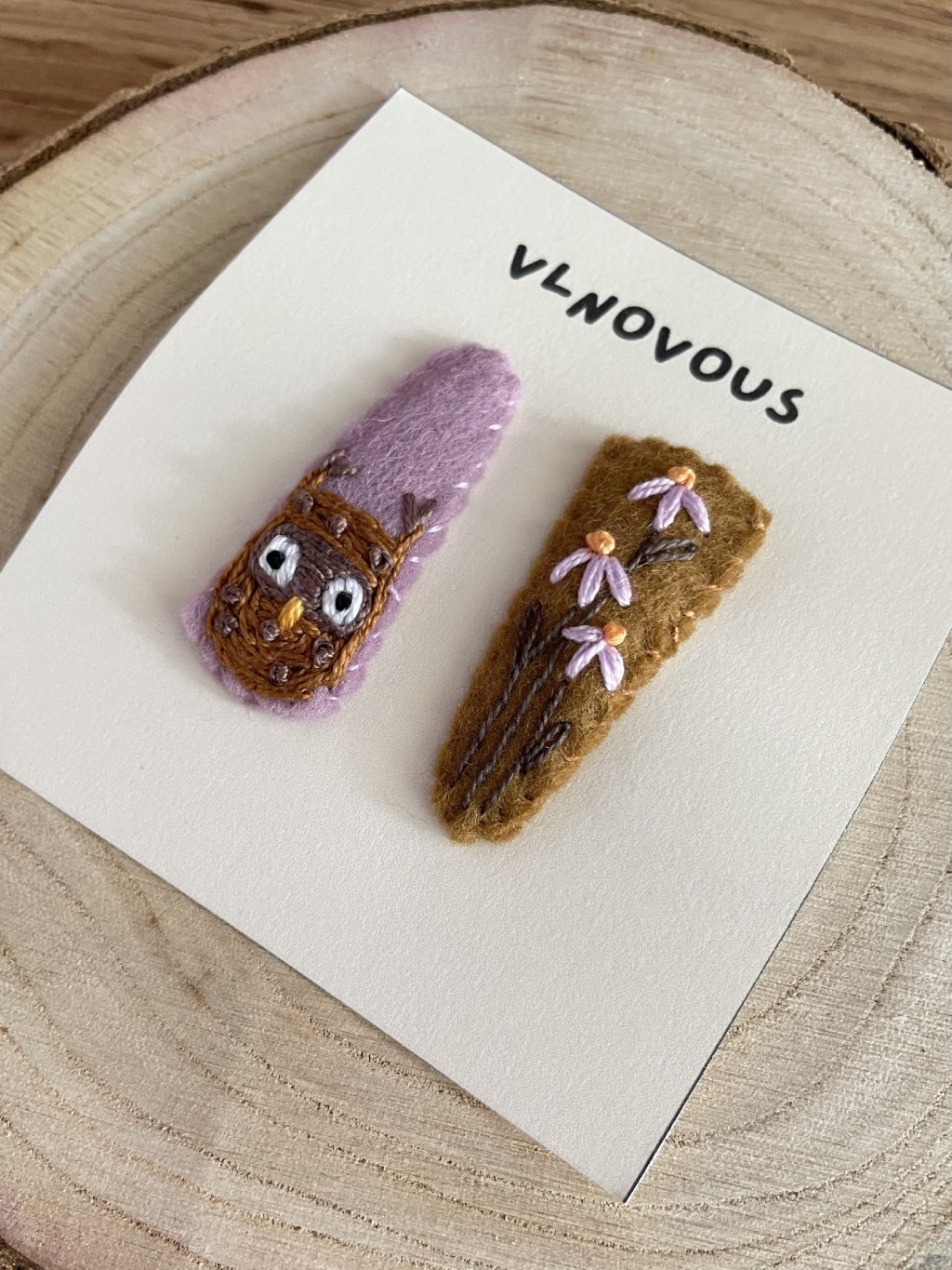 Ručně vyrobené sponky z plsti s autorským motivem.